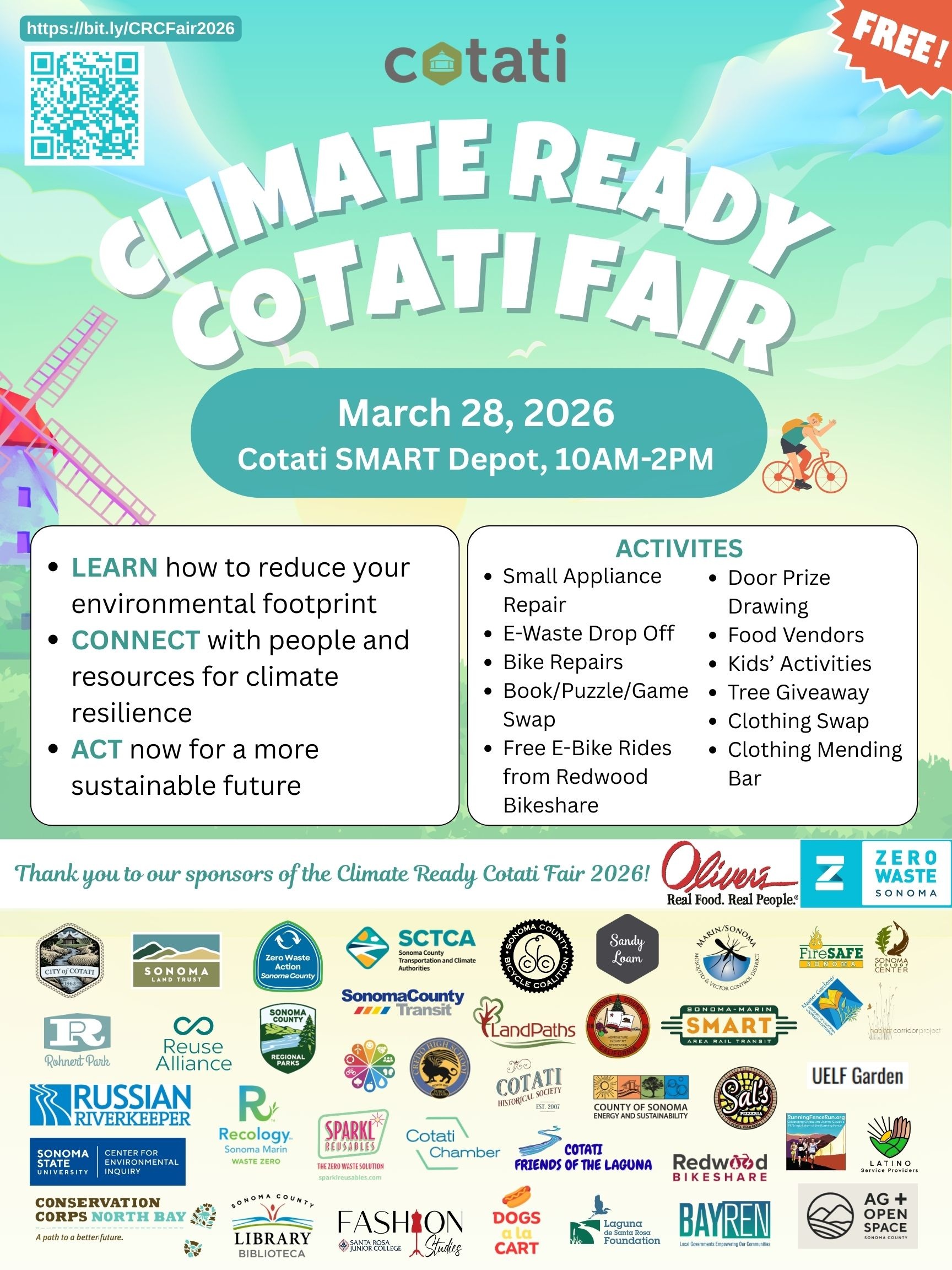The second annual Climate Ready Cotati Fair hosted by the City of Cotati is fast approaching! This year’s version of last year’s hit event will have an expanded footprint and plenty of fun attractions for all ages. A scavenger hunt, local food vendors, sustainability-centered kids activities, and an e-waste drop off are just a few of the activities the Fair has to offer! The Fair will once again be held at the Cotati SMART Train Depot,10:00 AM – 2:00 PM, and will be free to the community. Visit the Climate Ready Cotati 2026 webpage for more details on vendors, activities, prizes, and more!